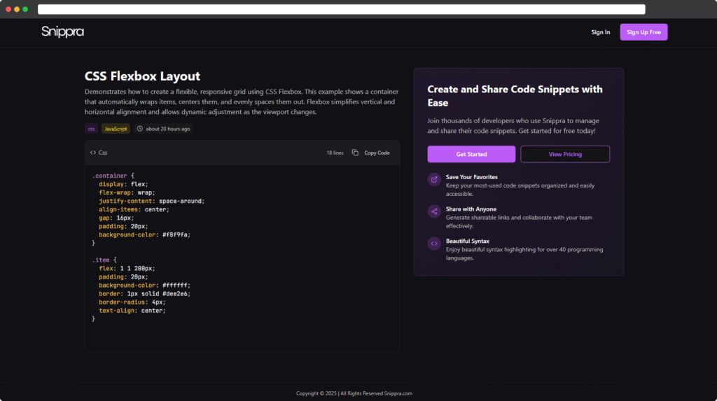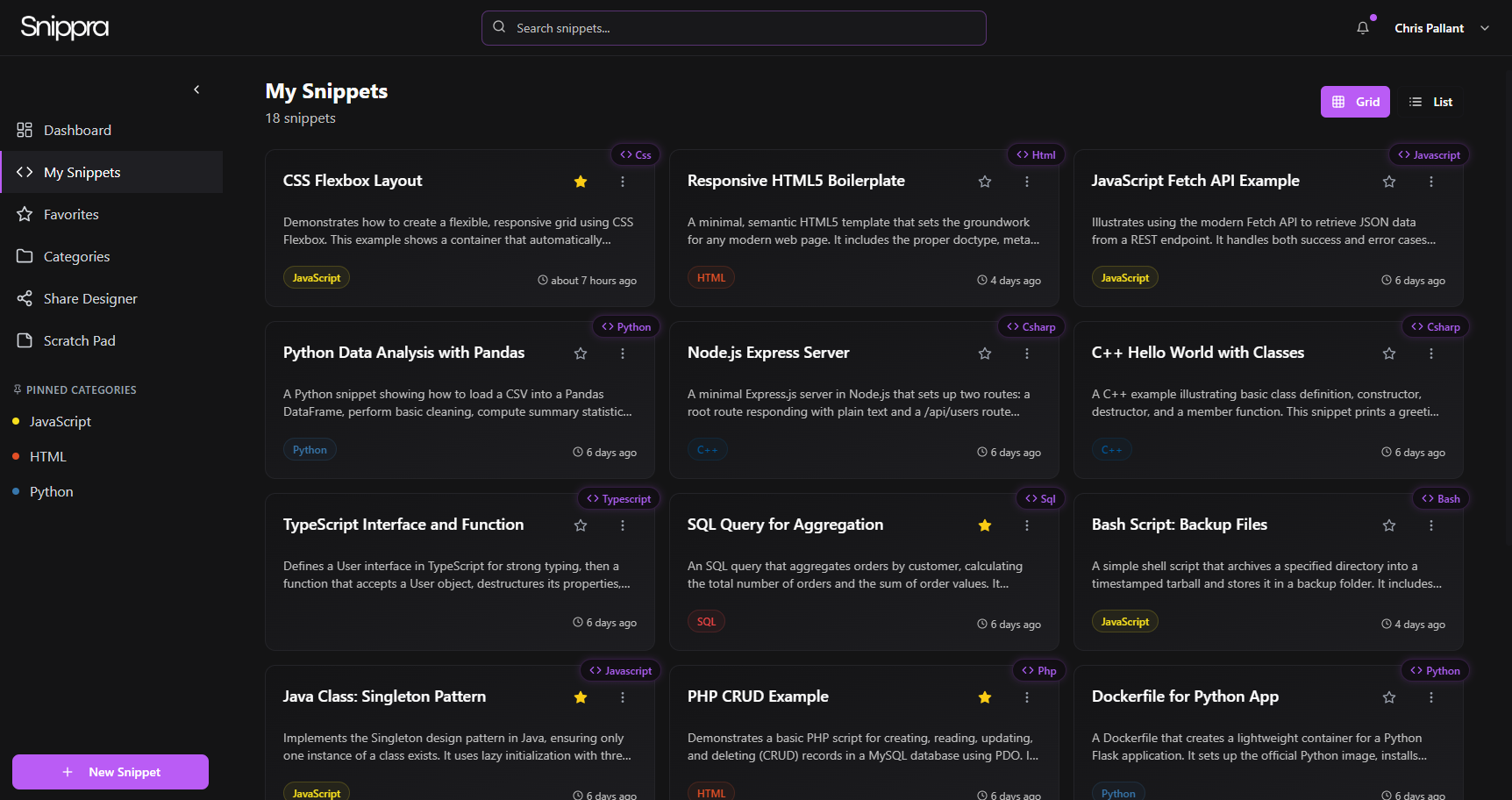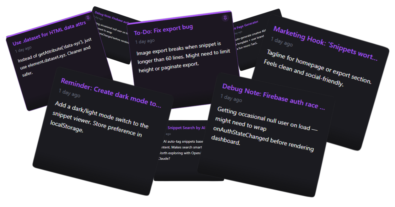 Group your snippets by language, project, or idea. Categories help you stay organised without slowing you down — because chaos kills momentum.